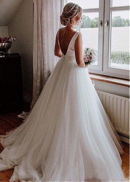 Tulle u0026 Satin Bateau Bowknot V-cut Back A-line Wedding Dress
